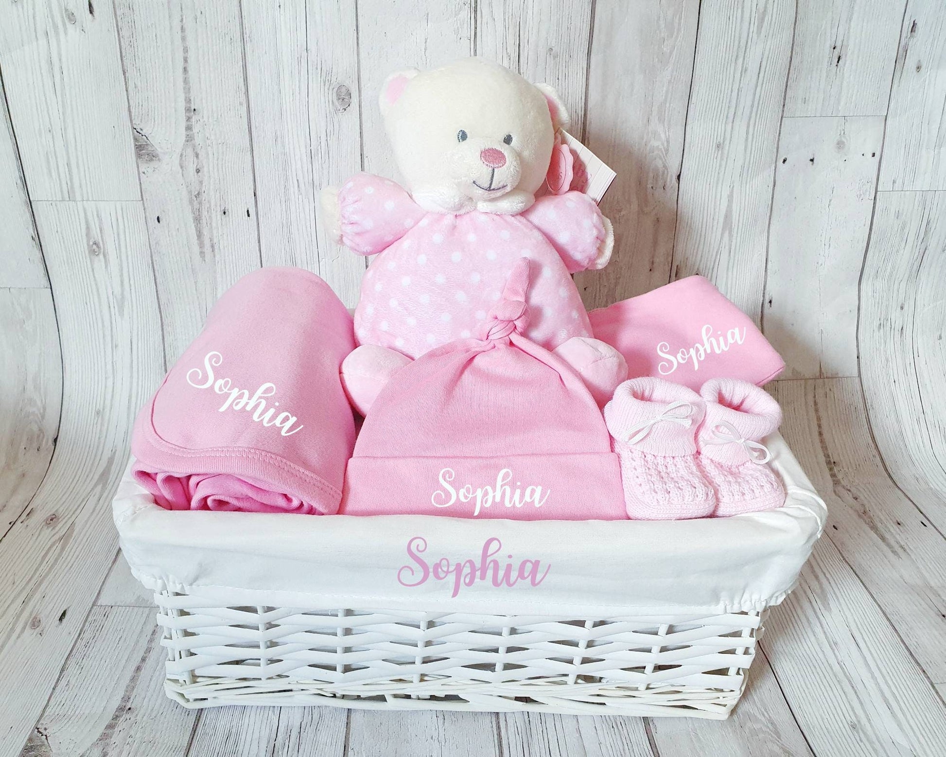 Personalised Baby Girl Gift Basket: Pink Blanket, Hat, Booties & Bear