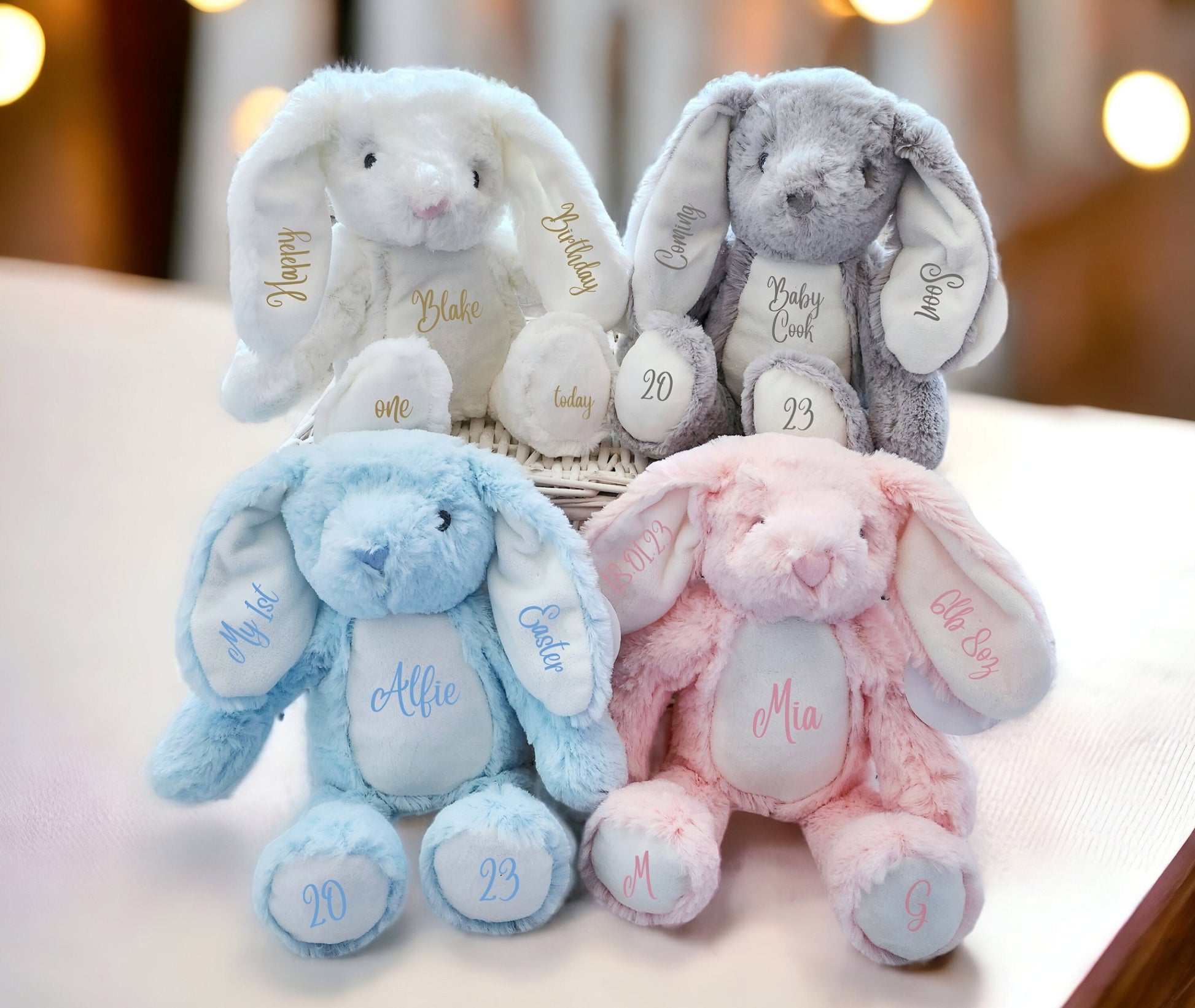 Personalised Bunny Rabbit Cuddly Toy New Baby Gift Soft Plush Grey Cream White Custom Newborn Present Children's Girl Boy Easter