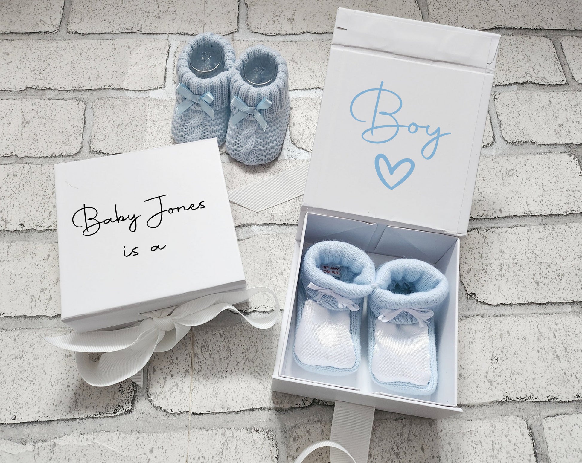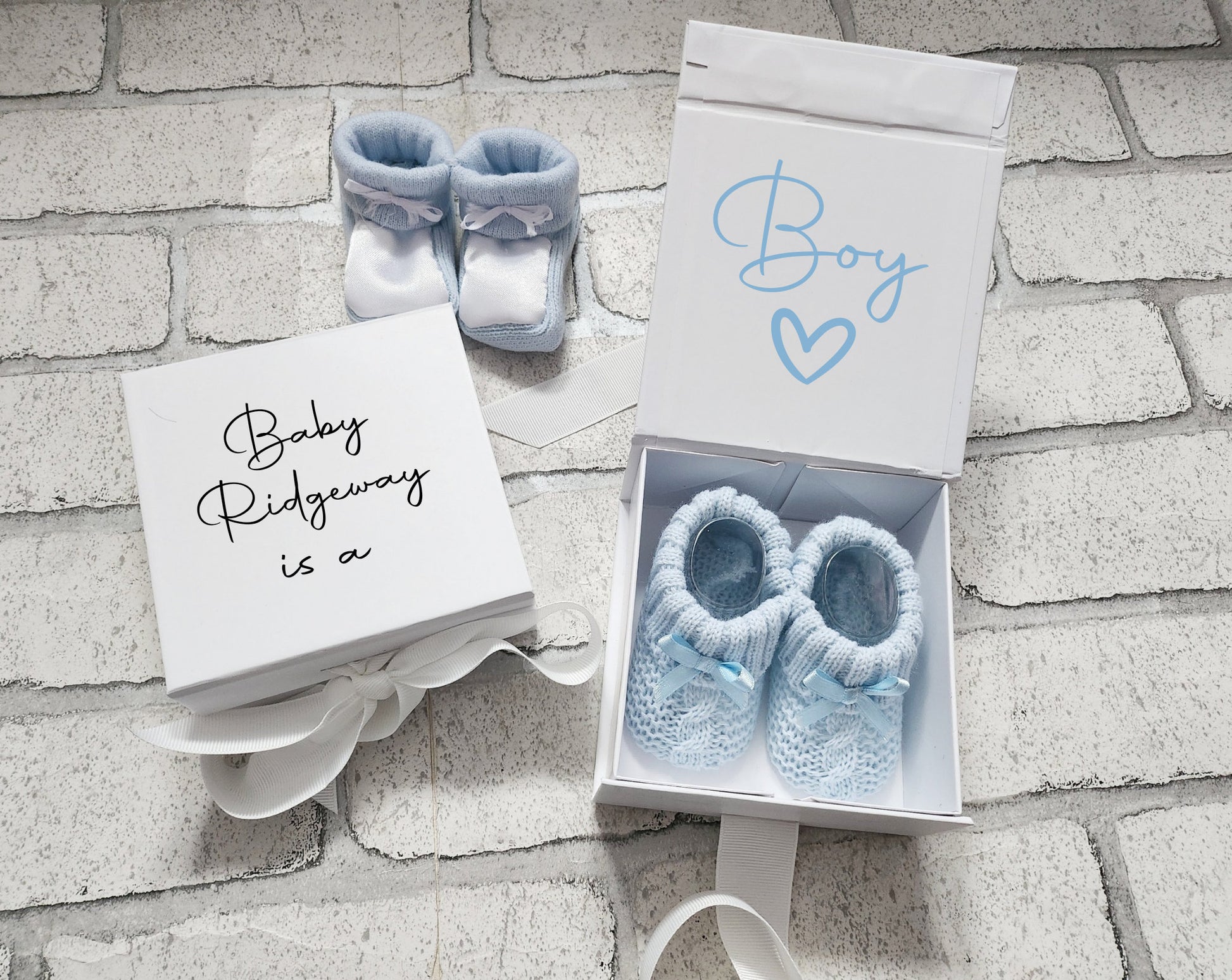 Personalised Gender Reveal Pregnancy Announcement It's a Boy or It's a Girl Baby Booties Gift Boxed Pink or Blue Cute Novelty