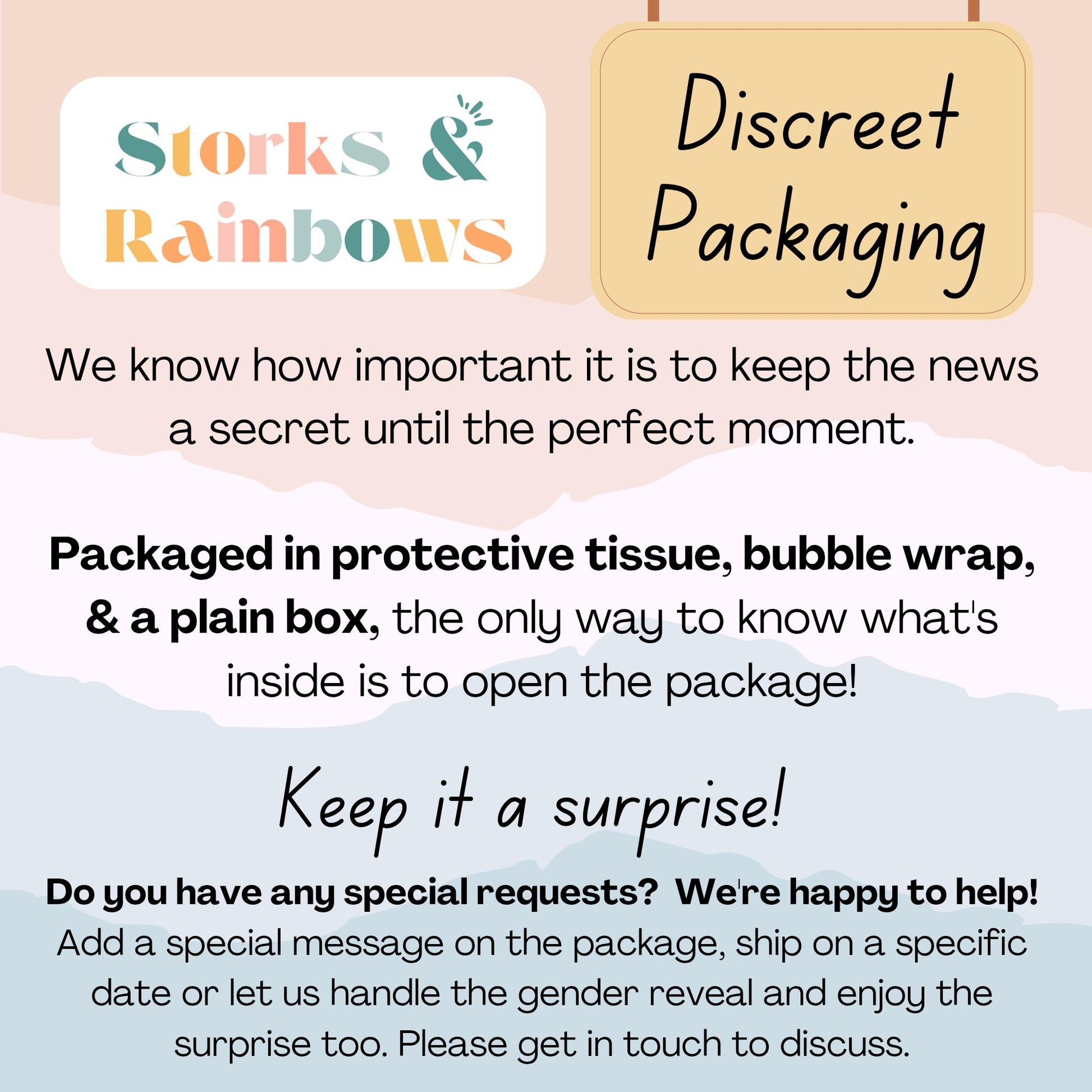 The lid of the box says Baby and Surname or any name or nickname of your choice followed by "is a" and inside the box is "girl" or "boy" with a little heart in pink or blue with matching colour booties.