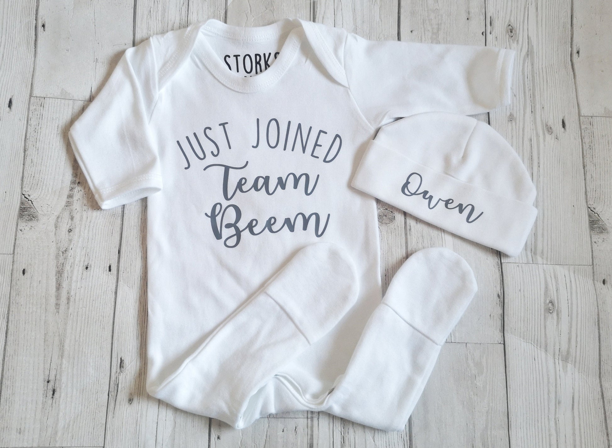 This sleepsuit features the words "Just Joined Team" followed by baby's surname.