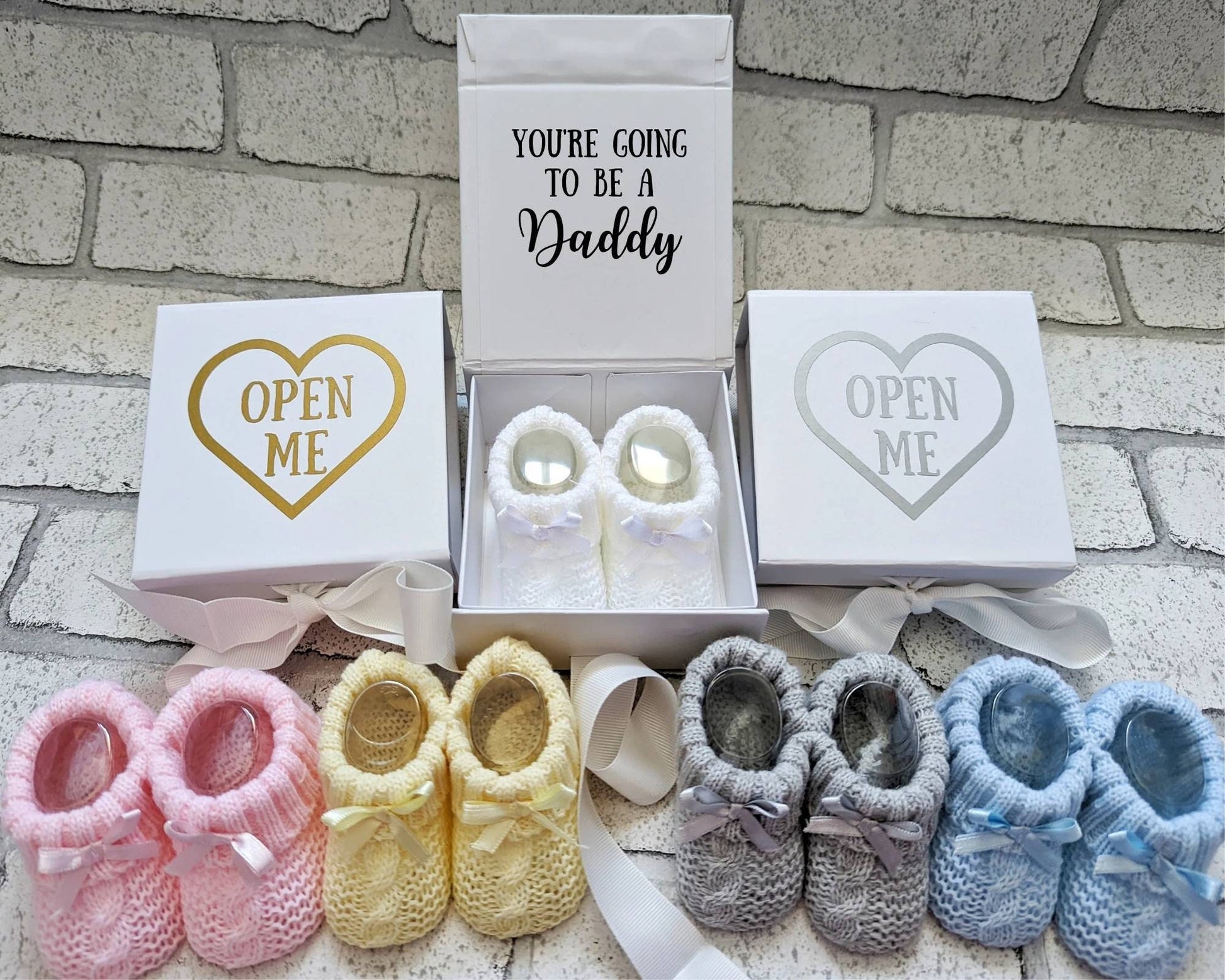 Personalised Pregnancy Announcement Gift Boxed Baby Booties You're going to be Parents Daddy Mummy Grandparents Any Name Any Text Surrogacy