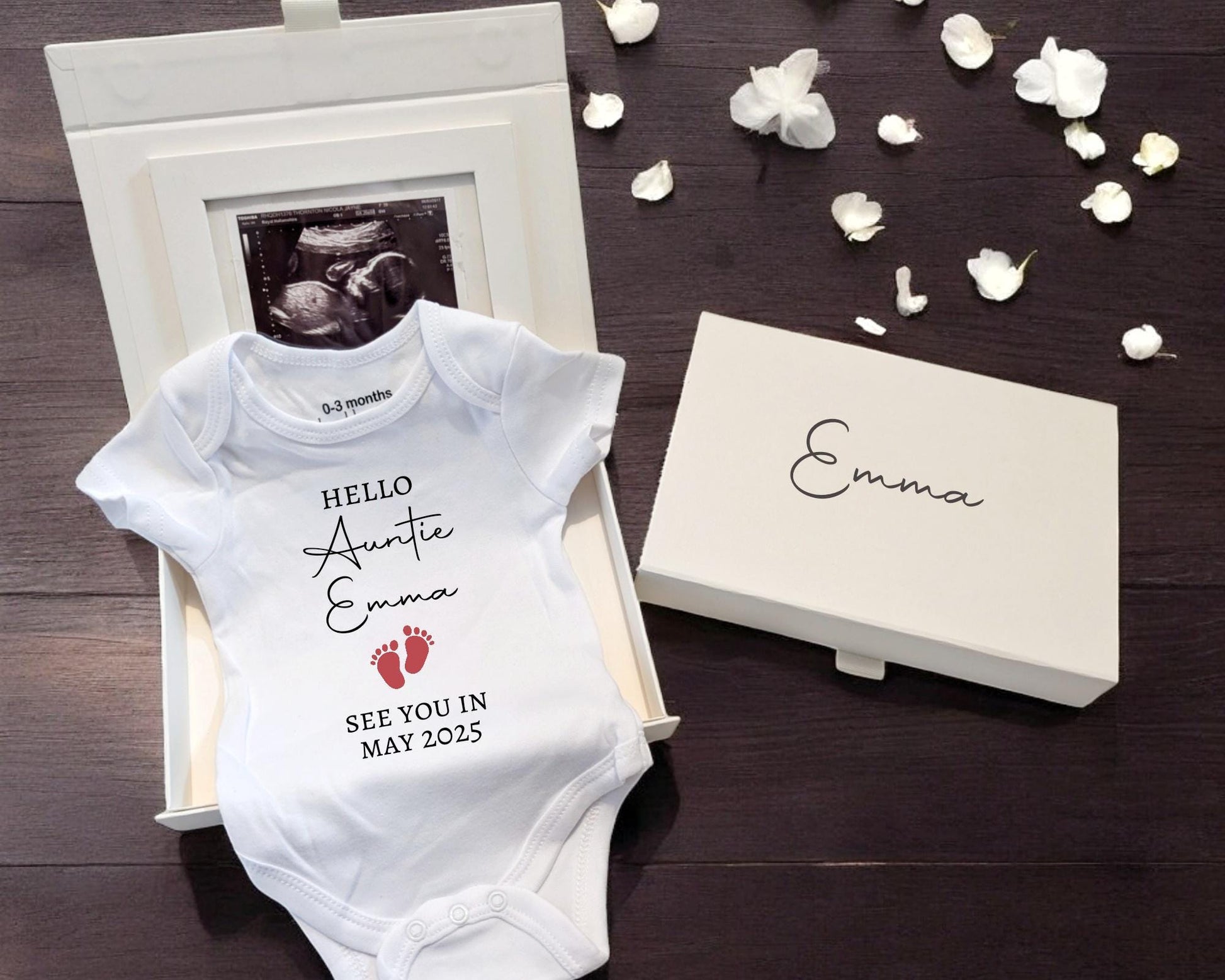 This is a gift box with a short message of your choice on the outside, containing a frame* perfect for a scan photo, or another special photo, and a bodysuit with the words "hello (their name)" followed by baby feet in your choice of colour and then " see you in (baby's due date)".