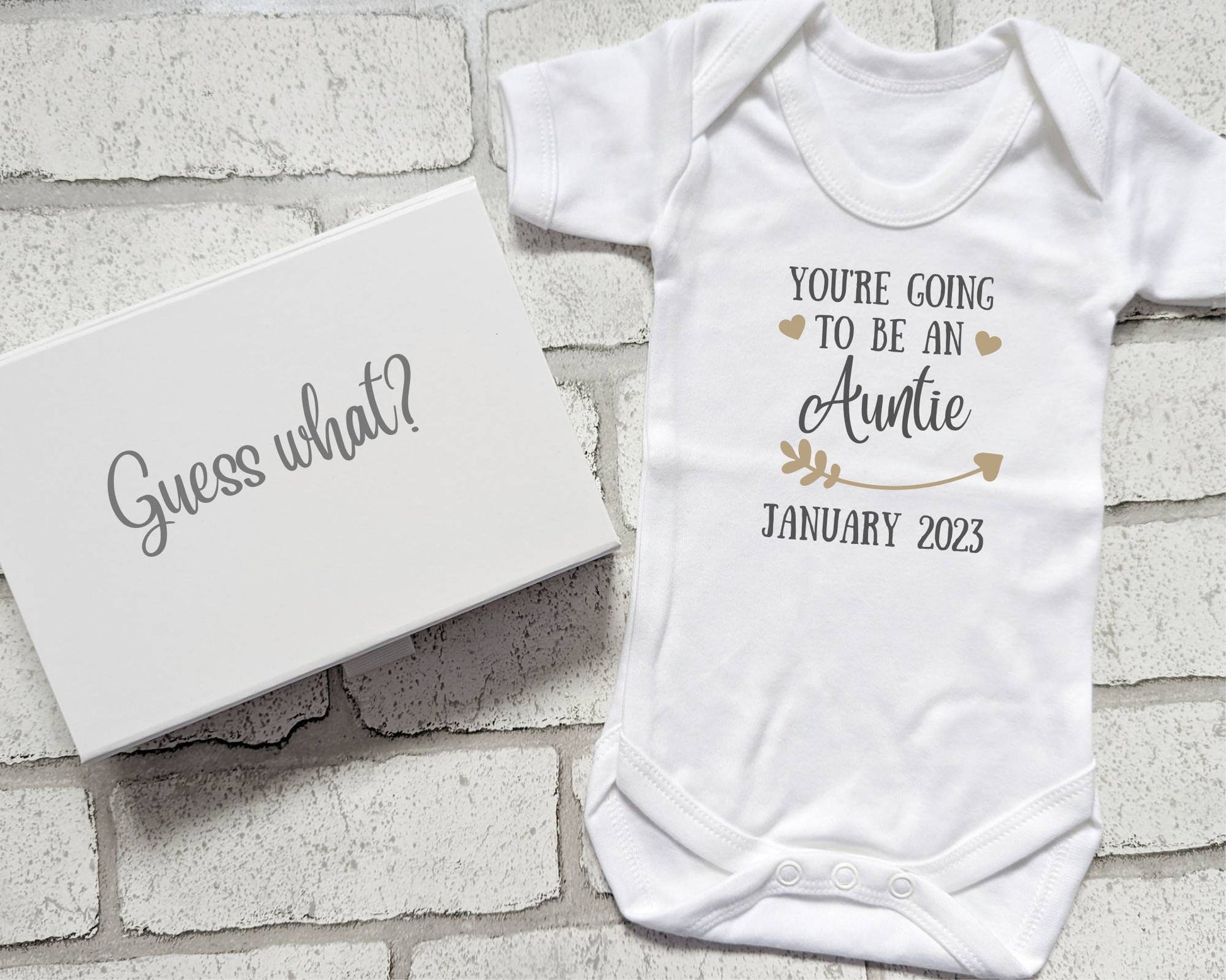 Personalised Pregnancy Announcement You're going to be an Auntie Bodysuit in Box Baby Gift New Parents Baby Coming Soon Open Me Keepsake Box