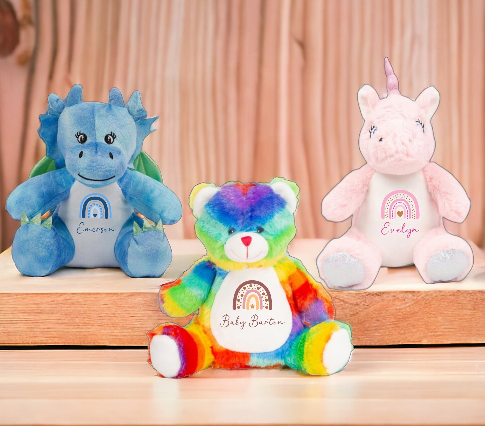 Personalised Soft Toy Gift For Kids Rainbow Name Animal Plush Cuddly Birthday Present Brother Sister Lion Unicorn Dragon Koala Monkey Dog