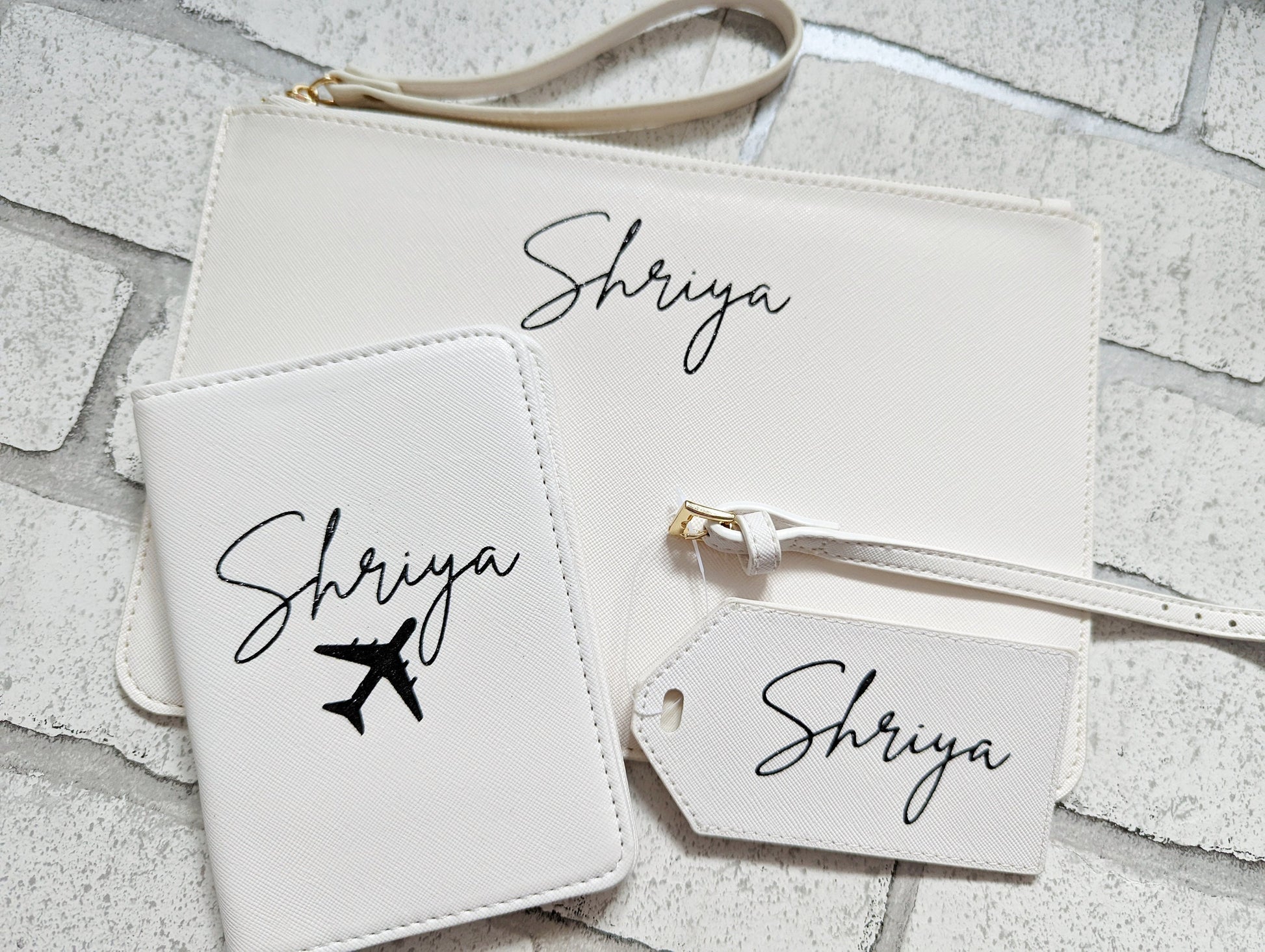 Personalised Travel Set Passport Cover Luggage Tag and Clutch Bag Custom Pouch Name Initial Faux Safffiano Leather Gift For Her Bride