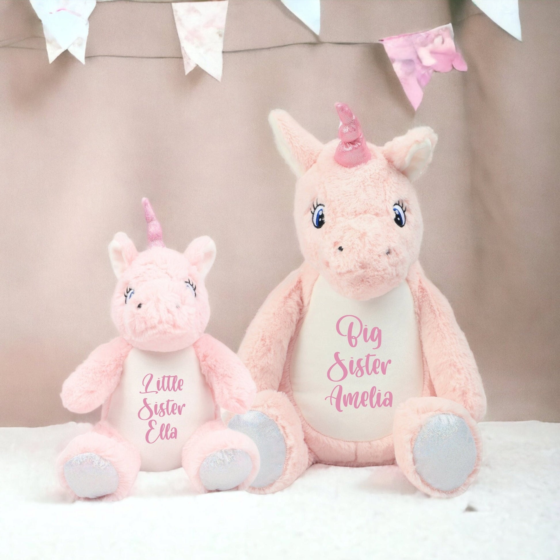These adorable cuddly unicorn plush soft toys are perfect gifts for any unicorn lover. The best thing is they are personalised. This means it's a great birthday present or perfect gift for sisters or baby girl.
