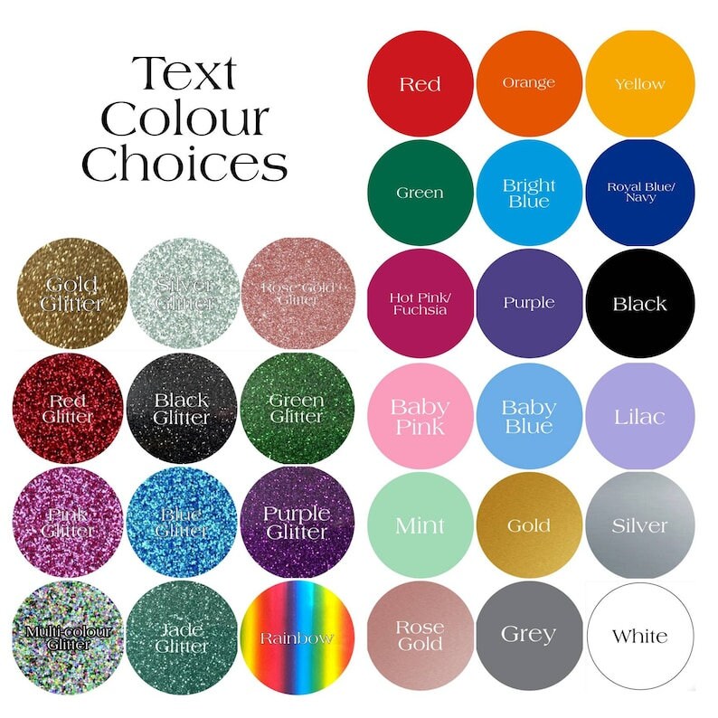 Text colours and finish choices are available. Choose between standard matt finish, glitter or rainbow holographic.